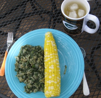 Here it is cooked up, with corn on the cob. oh cool, it's Green Bay Packers colors. That drink by the way is veggie broth. Whenever I steam veggies, I make "tea" out of the water. I don't know what I steamed this day. Maybe I just used the water from boiling the corn.